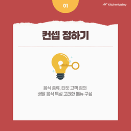 어떤 종류의 음식을 제공할지, 타겟 고객은 누구인지 정의합니다. 배달이나 포장에 특화된 음식이기 때문에 이동 중에도 품질이 유지되는 메뉴로 구성해야 합니다. 그 결과로 주방에서 고객에게 전달되는 동안 음식의 퀄리티를 유지할 수 있습니다.